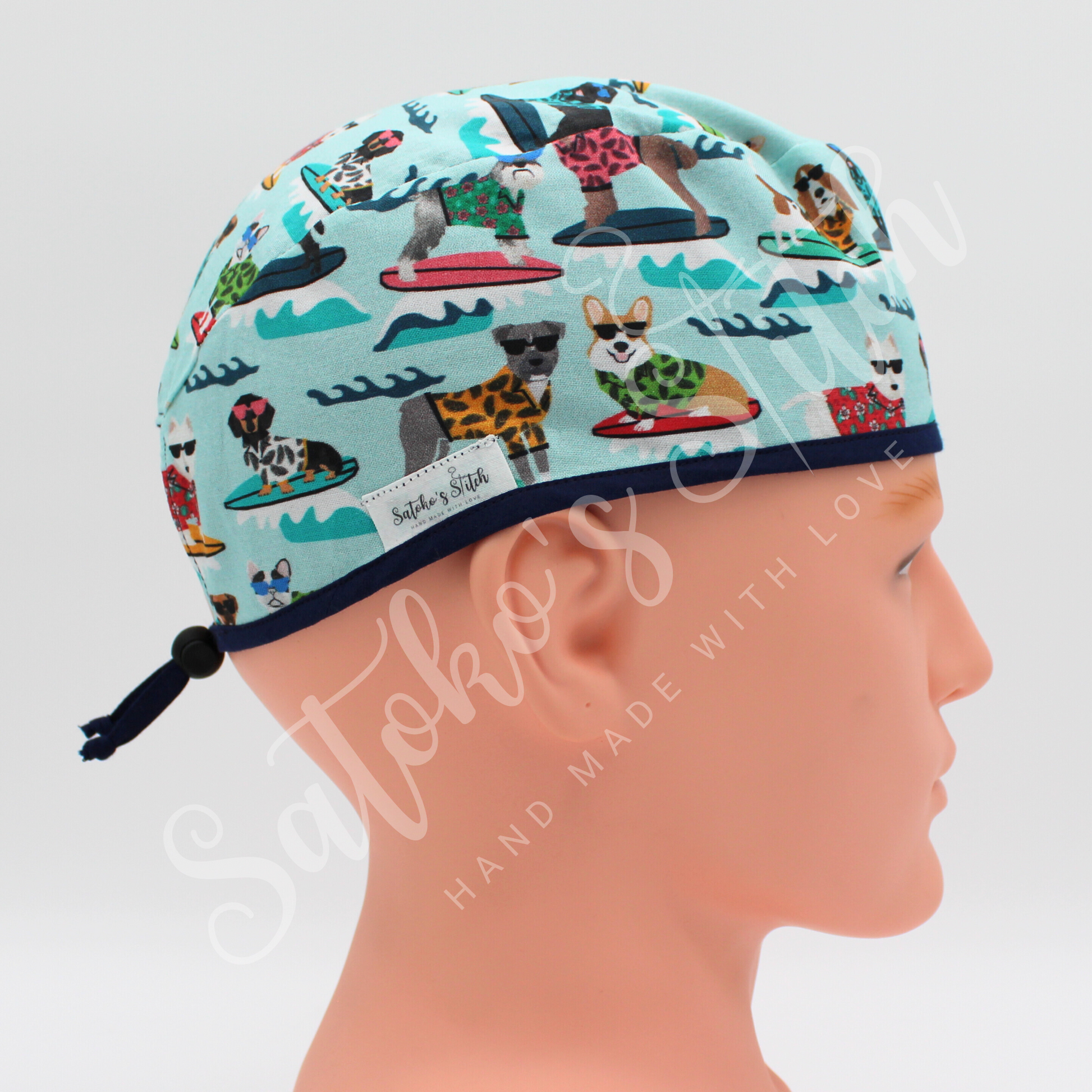 Male scrub hat with toggle tag on the back for easy adjustment. Hand made with cotton fabric in the USA. The fabric is pre-washed to prevent shrinkage.